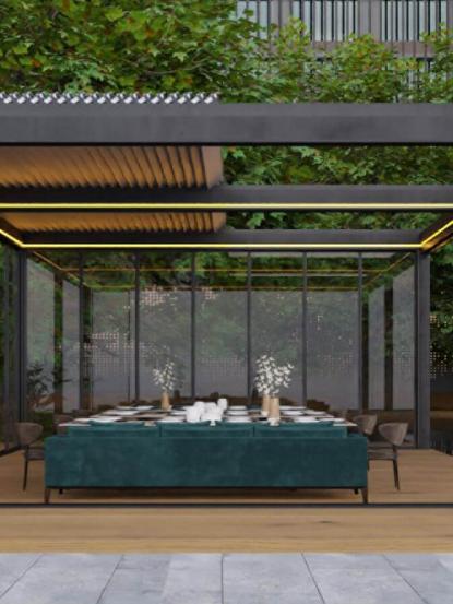 PERGOTECH sistemleri alüminyum strüktürden oluşur. Full inox vida ve bağlantı parçaları kullanılır. Kullanılan blackout kumaş alev yürütmeme özelliğine sahiptir. Kolay temizlenir.